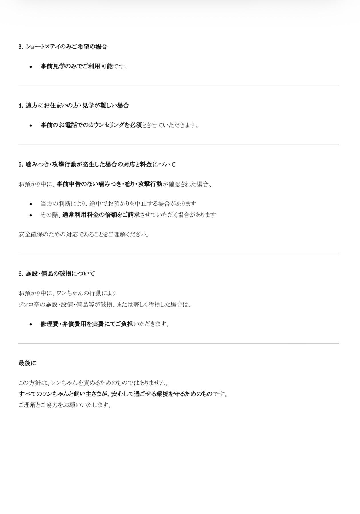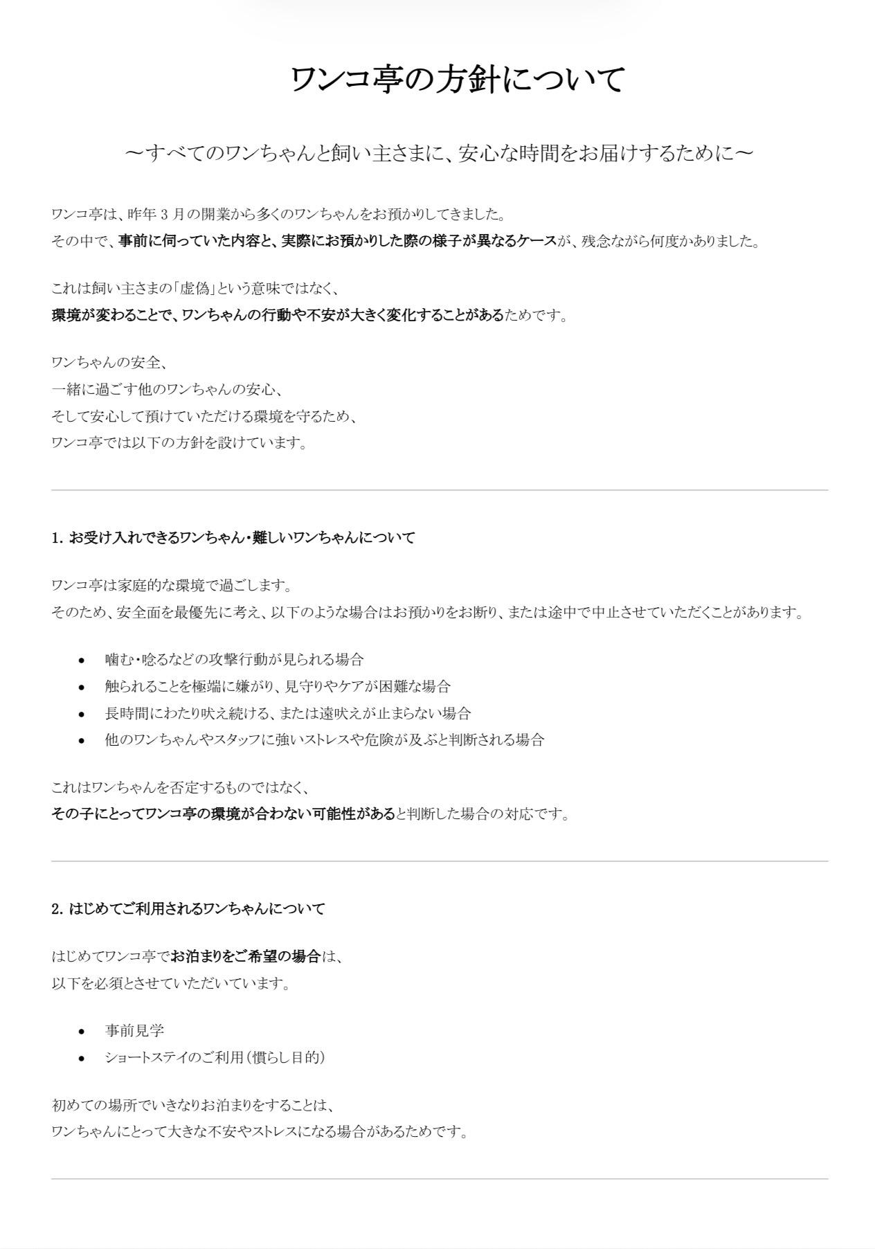 そのため、ワンちゃんの安全、お預かり環境の安心、そして飼い主さまに安心してお任せいただくために、このたびワンコ亭のご利用方針を明確にいたしました。